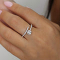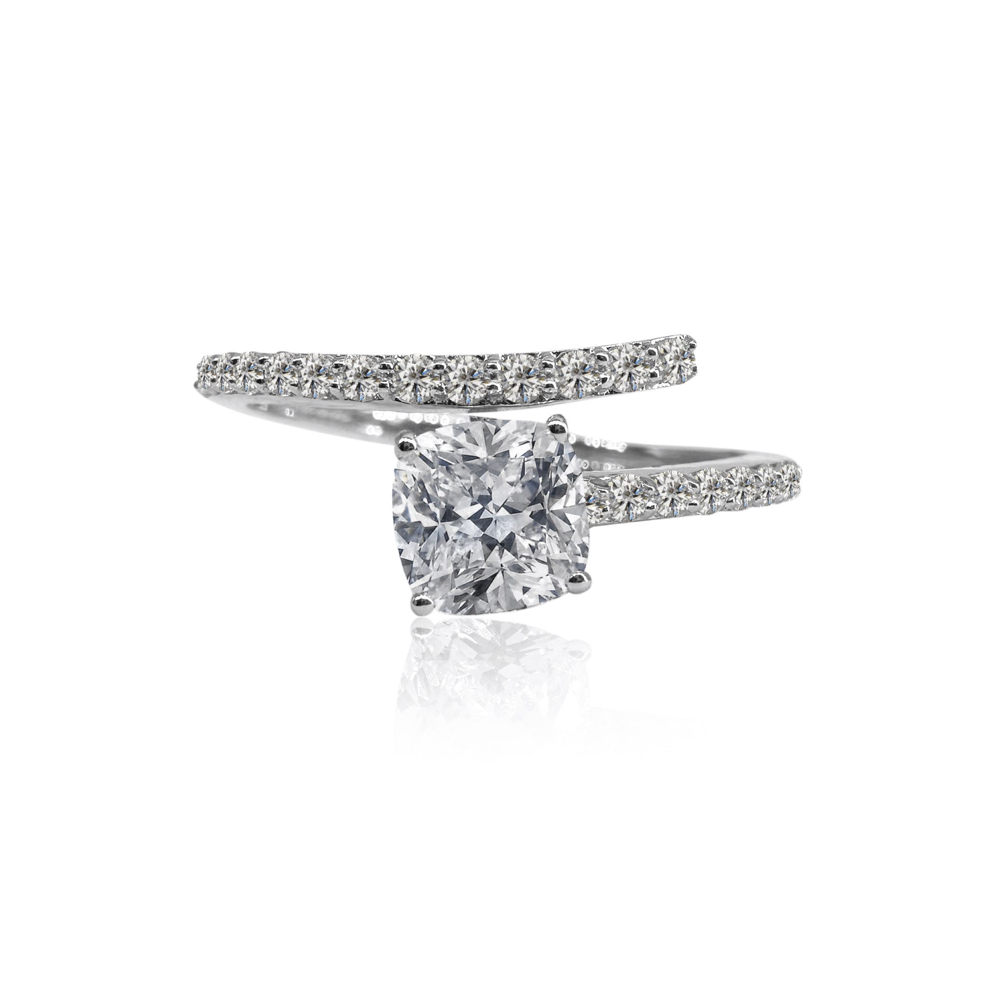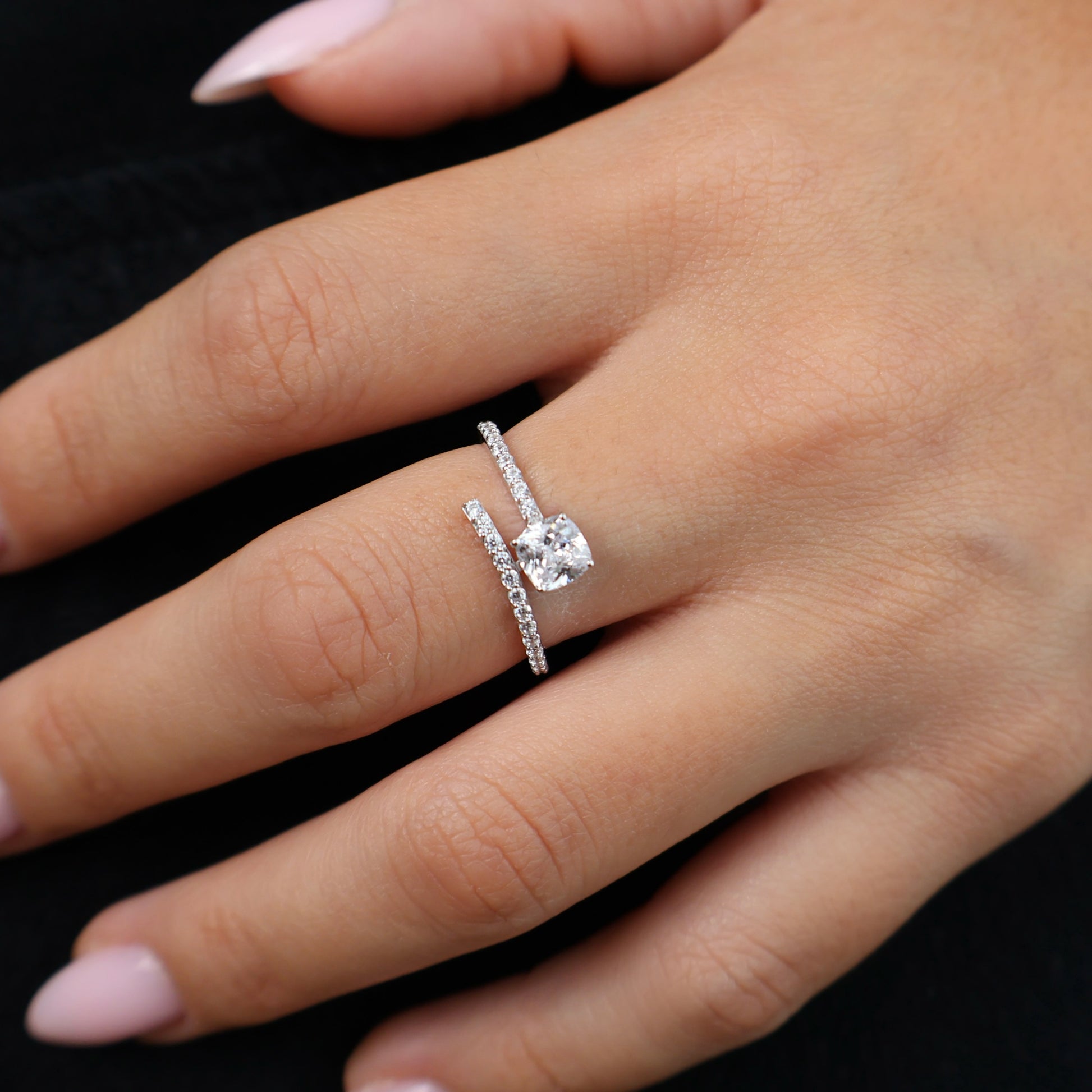 טבעת חצי ספירלה בזהב לבן משובצת זירקונים.