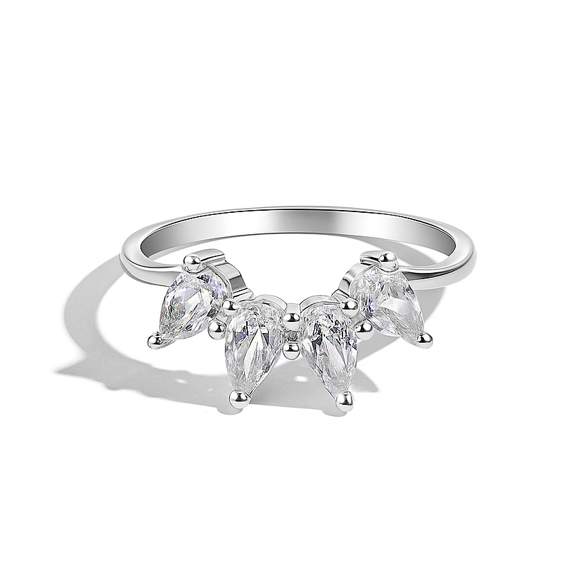 טבעת יוקרתית ועדינה משובצת בארבעה זירקונים בצורת טיפה המסודרים כמניפה