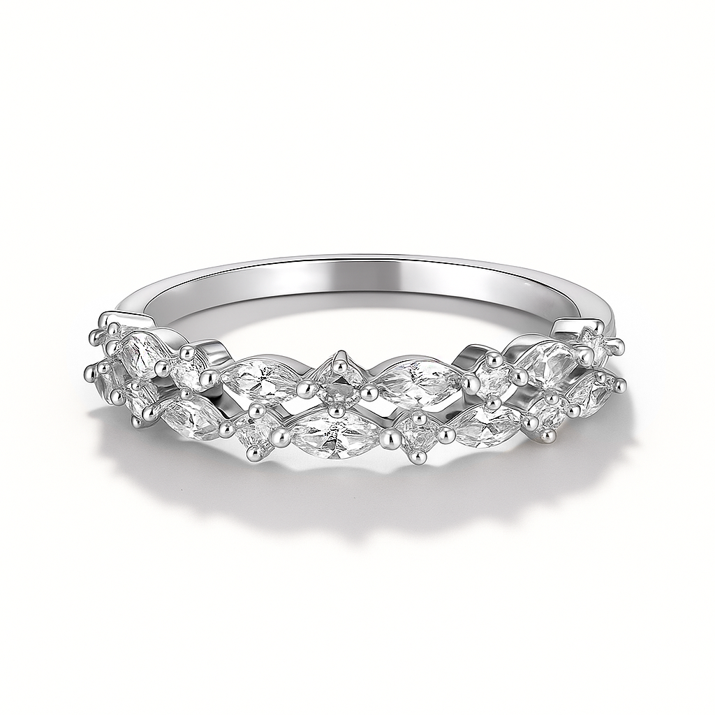 טבעת 2 שורות משובצות זירקונים בחיתוך עגול/מרקיזה במראה שזור