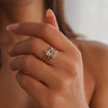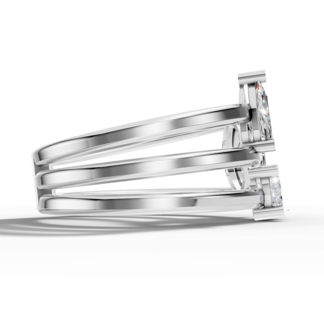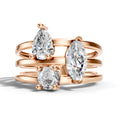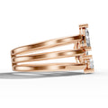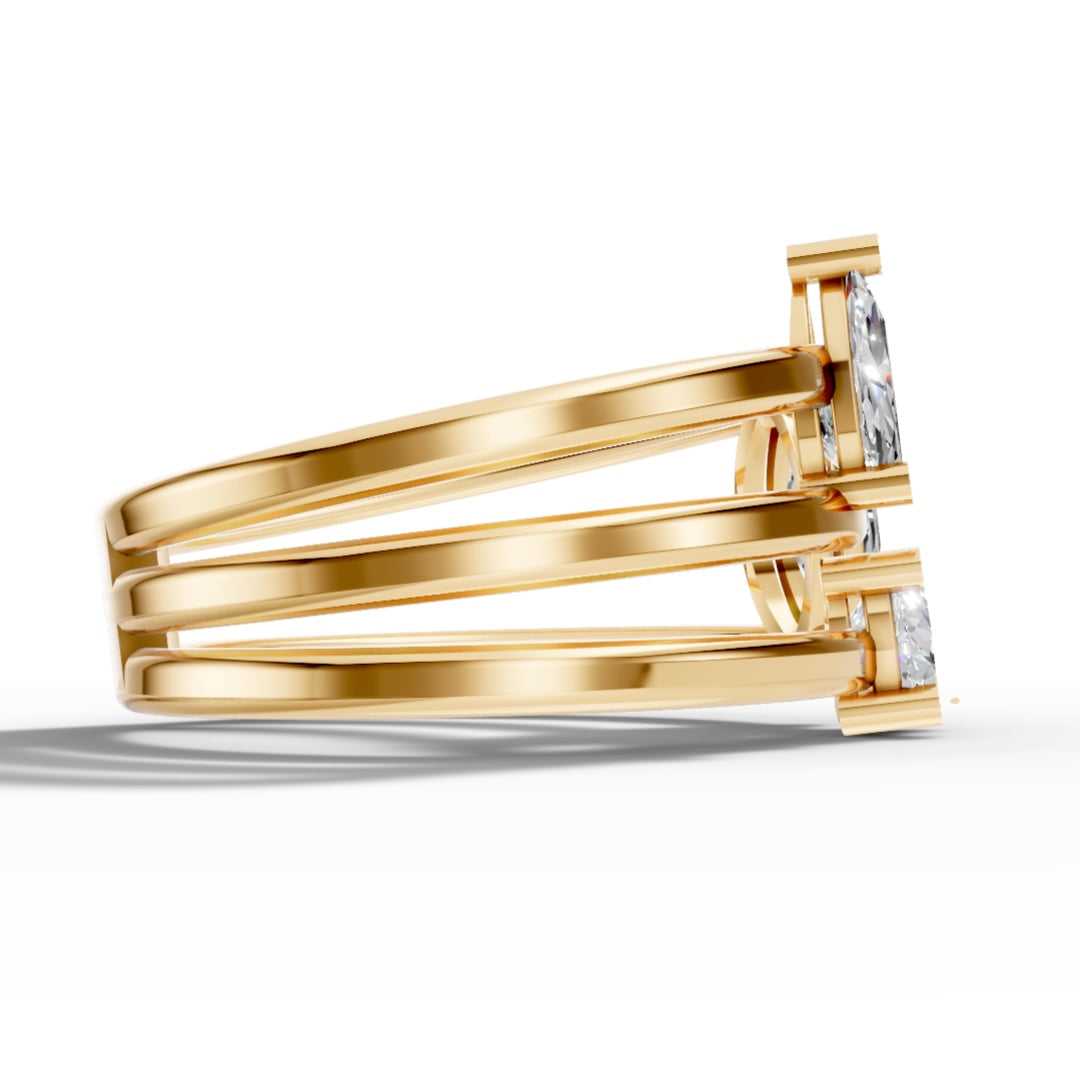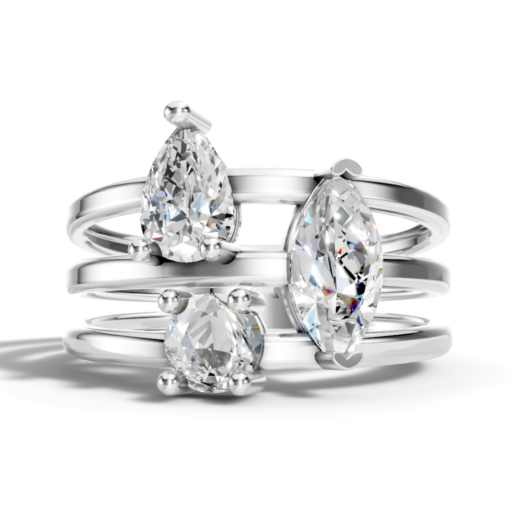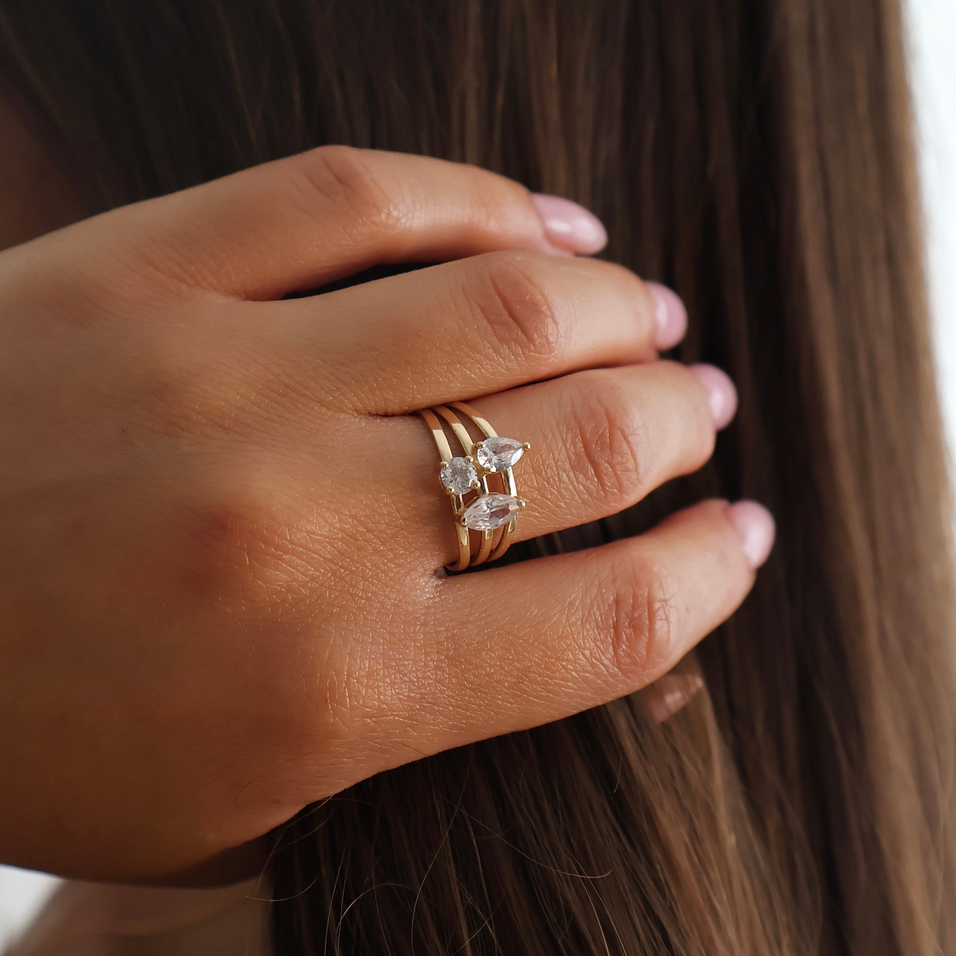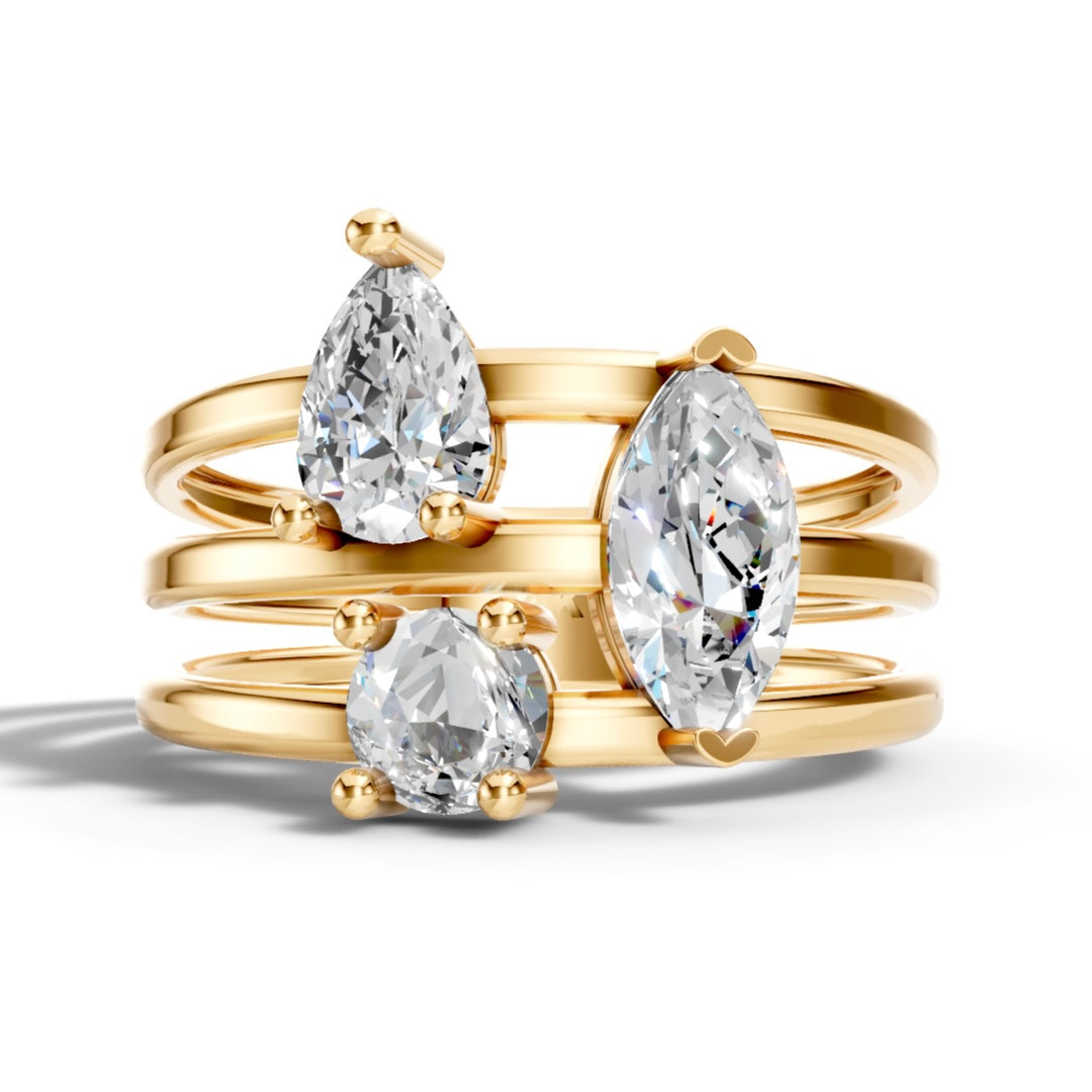 טבעת 3 פסים עשויה זהב משובצת ב3 אבנים בחיתוכים שונים: מרקיזה, טיפה ועיגול