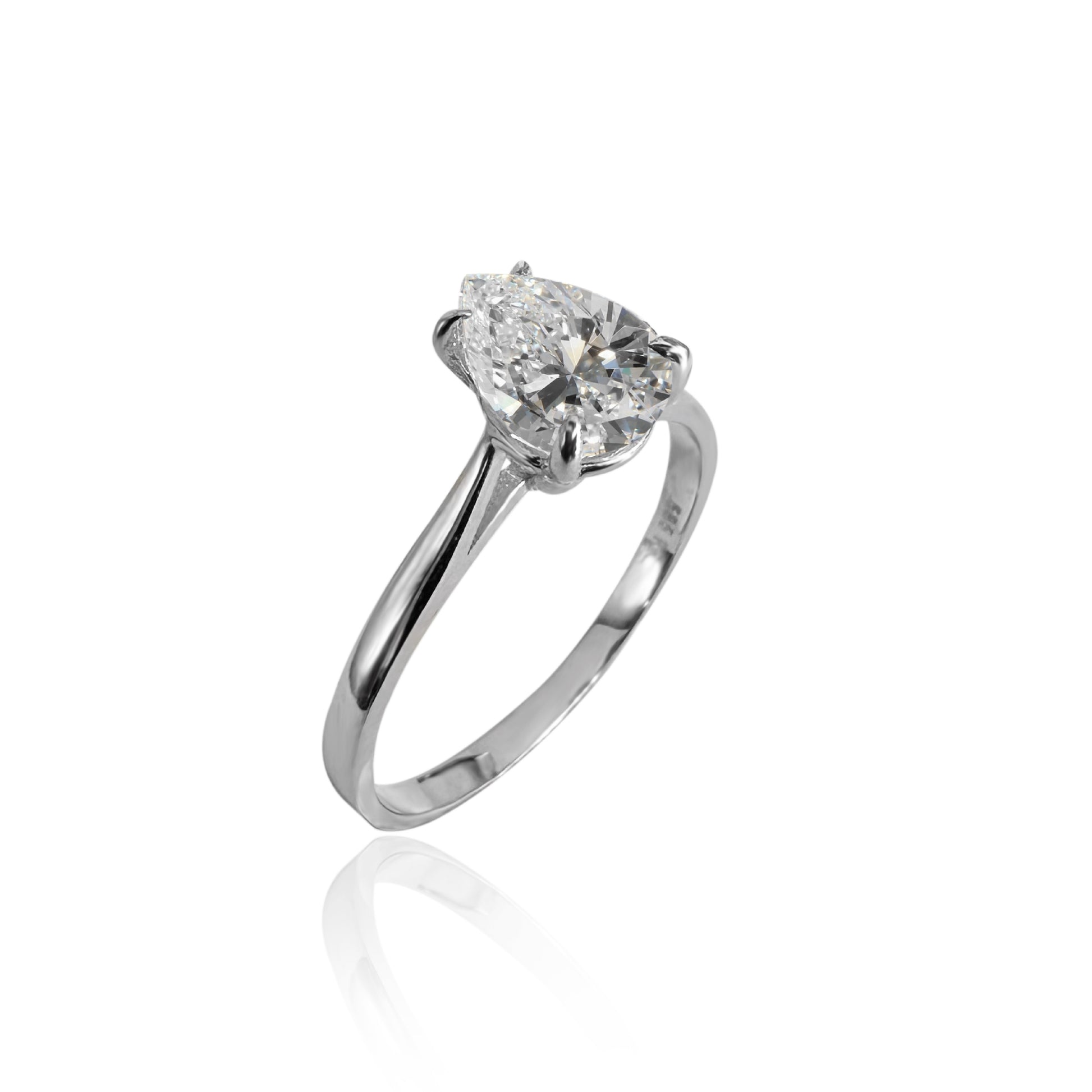 טבעת סוליטר בזהב לבן עם זירקון מרכזי בחיתוך טיפה.